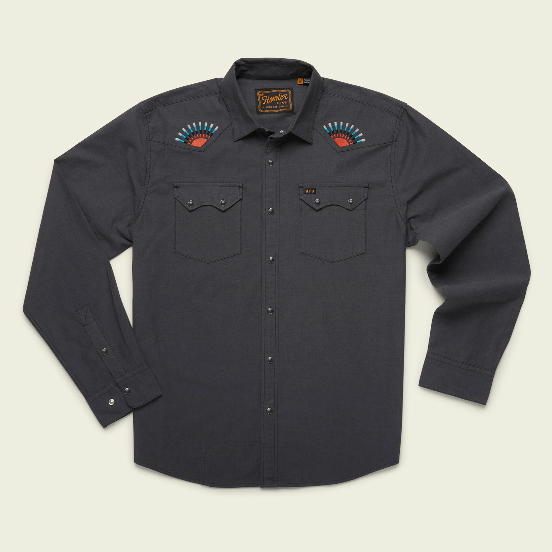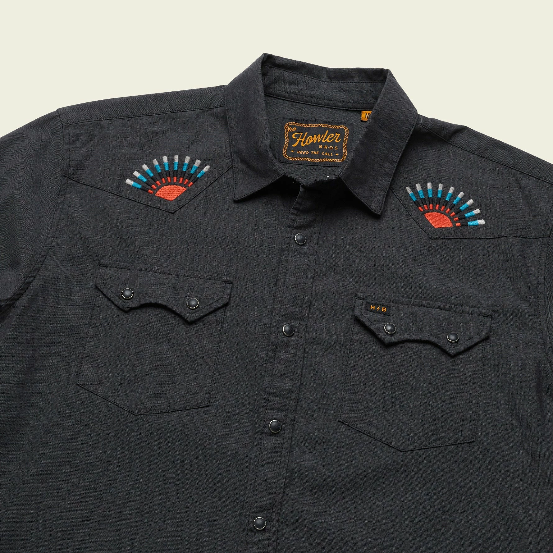 The Crosscut Deluxe is the most sought after item in our fall line year in and year out. Yes, the vintage inspired motif embroidery makes a big statement but so too do the bountiful pearl snaps, western yokes and robust stretch chambray. Collect these right along with your Gauchos for year-round Howler coverage.