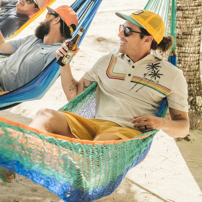 The Rookery Polo is an all-cotton homage to the 4-button polos you might find in your town’s vintage shop. We took out the mothball smell and scratchy fabric and subbed in our soft, ring-spun cotton and vintage style graphics. The Rookery has t-shirt comfort and style with polo versatility. Available in Palm Climber: Blue Heather & Cream Heather.