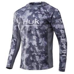The Huk ICON X Refraction Camo Hoodie, featuring our new exclusive camo pattern, is the most technically advanced performance fishing shirt designed for hardcore anglers. Comprised of Double Pony Polyester, this synthetic material spreads moisture over a larger surface area creating a rapid drying effect that cools the body after coming into contact with perspiration. The synthetic fibers allow air to pass through the shirt and contain a hydrophobic coating that transports sweat to drier areas, away from the skin.