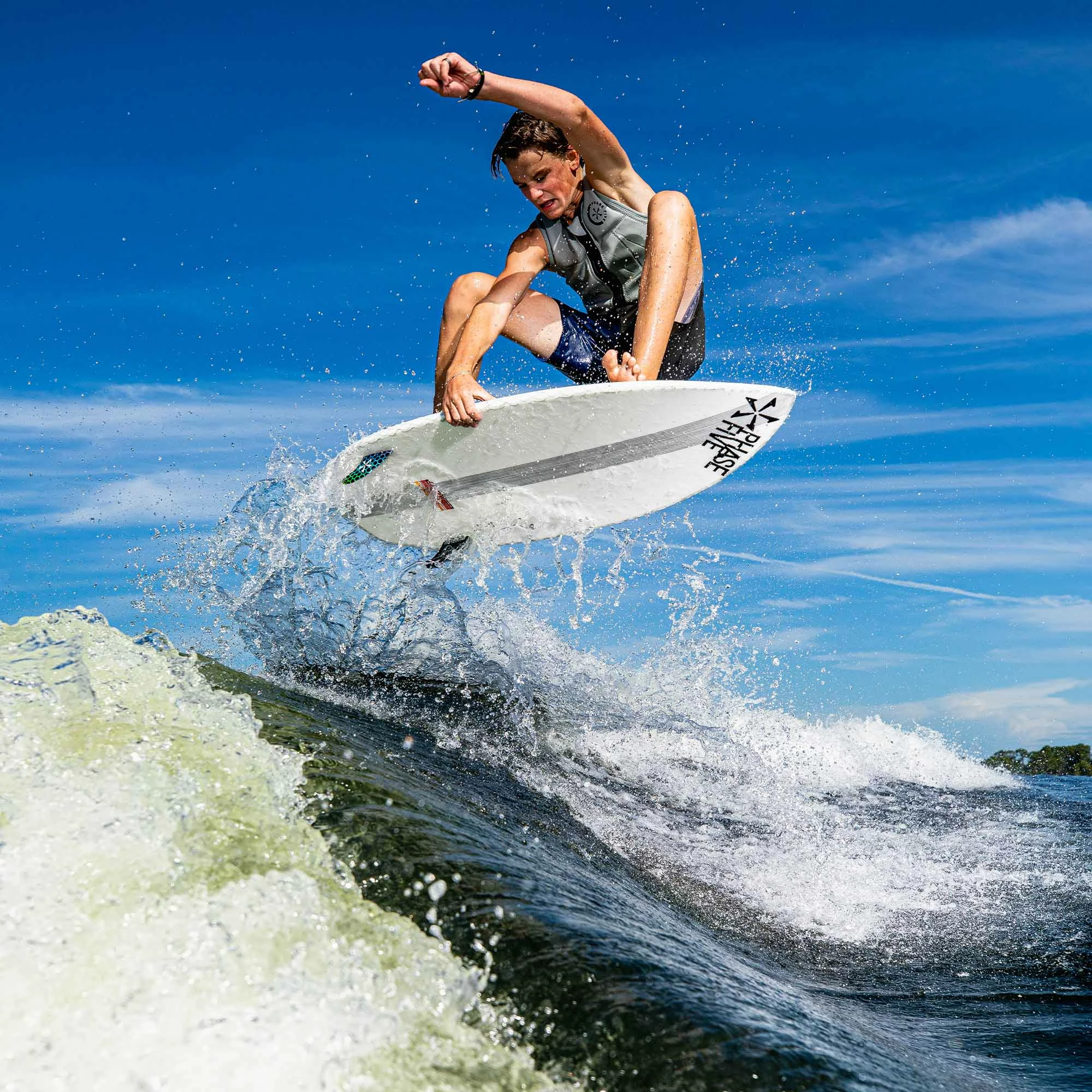 The Aku Wakesurfer was the first surf style board introduced by Phase Five. This is a fast, rail to rail, air boosting machine. The Phase Five Aku features a diamond bumped wing tail for optimum pivot and pop. It harnesses a nicely pulled in nose that enables aggressive carving on the wave without nose diving.