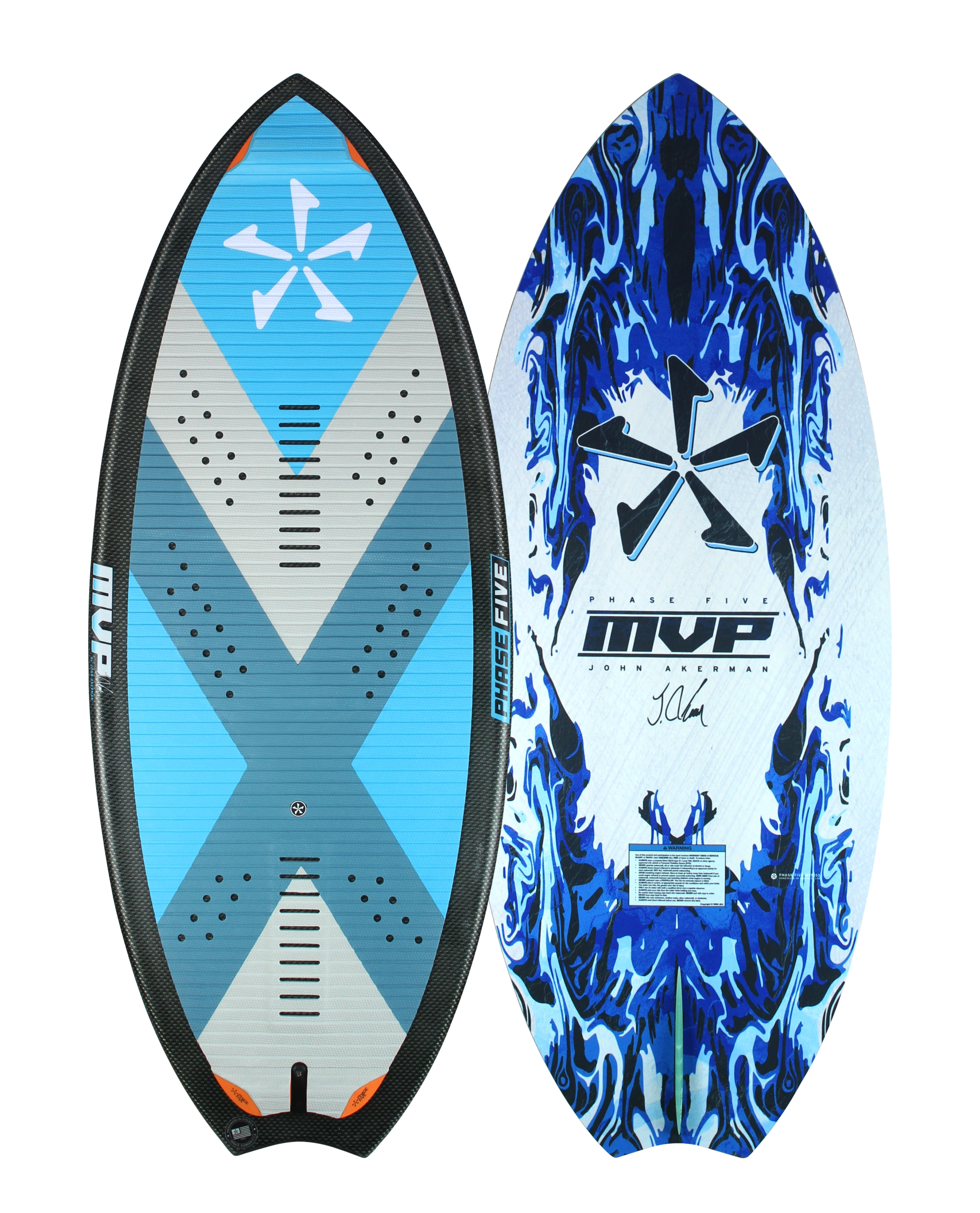 Supporting aggressive skim style riding, the Phase Five MVP Wakesurfer harnesses unique features not found anywhere else in our lineup. First you will notice a full decked Techno Traction V2 EVA grip pad with nose kick tail support for superior foot control. John’s idea for a kick tail in the nose was to gain more leverage to execute tricks while riding revert.