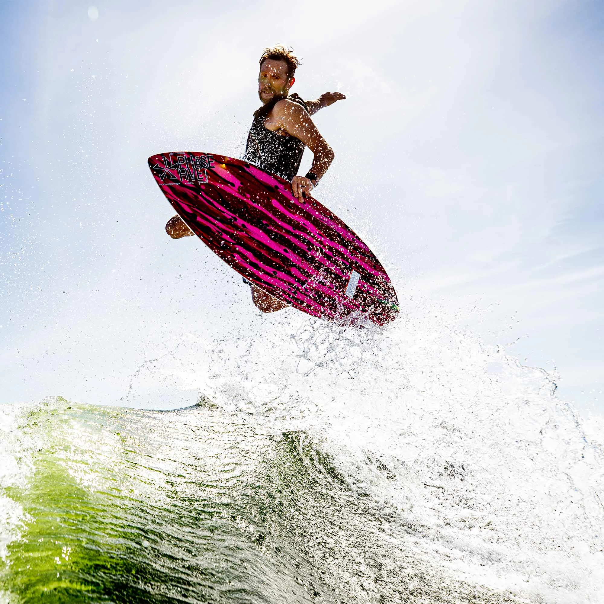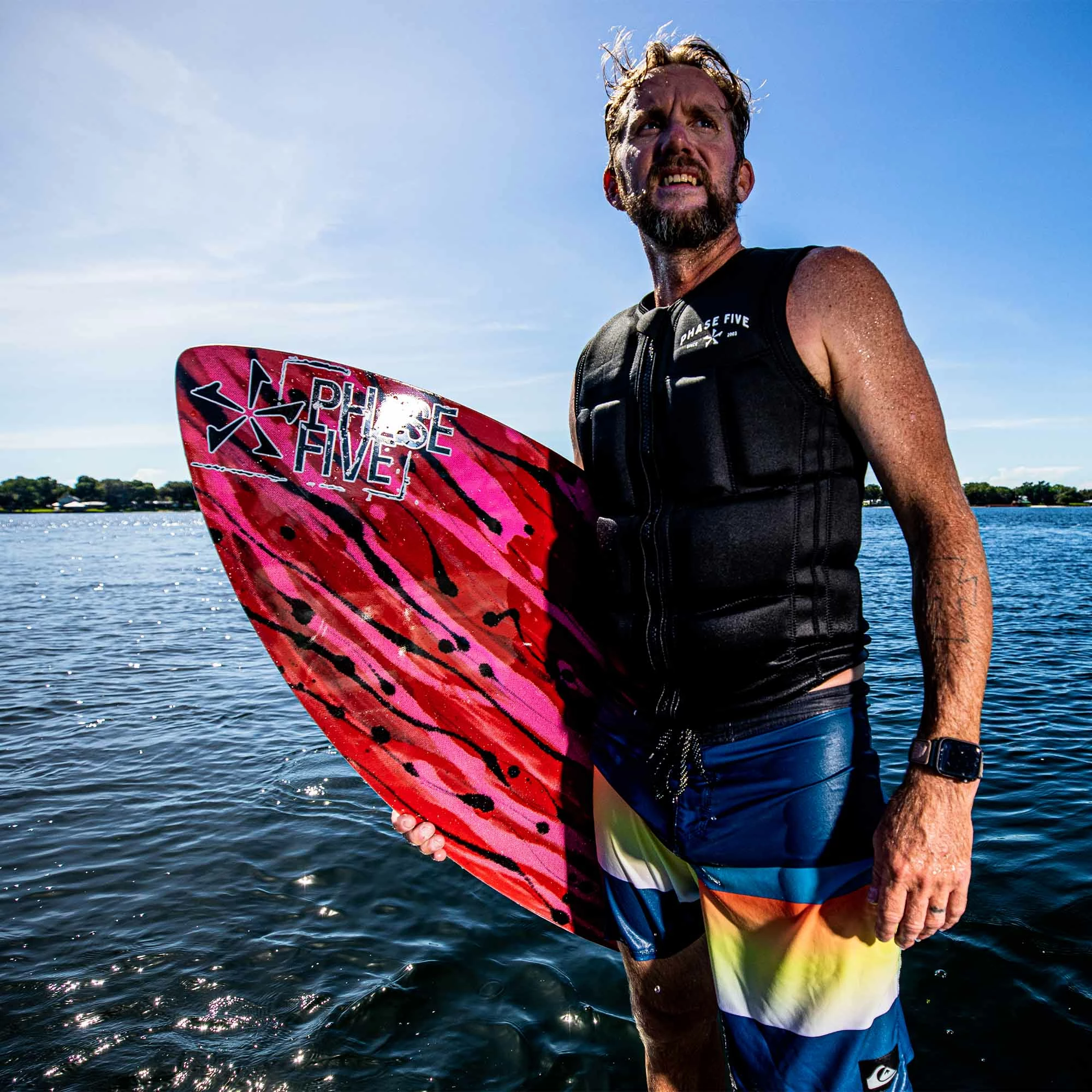 The Phase Five Ratchet Wake Skimboard is a versatile foot strap equipped wakesurfer. The straps secure the rider for insane tricks while being a great tool to learn how to stand up. Experienced riders enjoy the foot straps by placing tweaked out airs and even flips within reach. Anything is possible with the Ratchet! It comes equipped with a single fin setup and loaded with our 2” Skim Fin. You will never see two Ratchets that look the same – each one has its own handmade resin art bottom. Get ready to Ratchet up a notch!